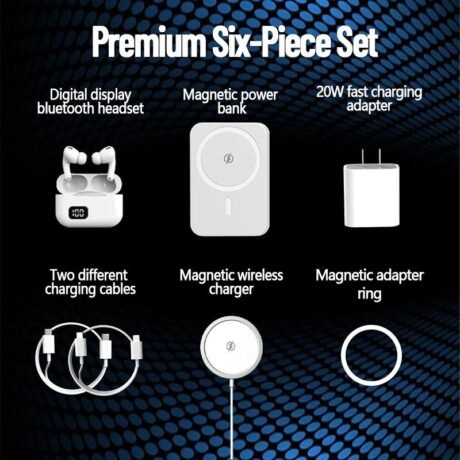 6-in-1 Charging Kit: Fast Charge. Magnetic Power Bank. Wireless Charger. Type-C to Lightning Cable. Adapter & Audio Support. Compact & Portable.